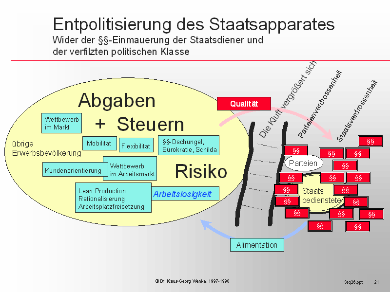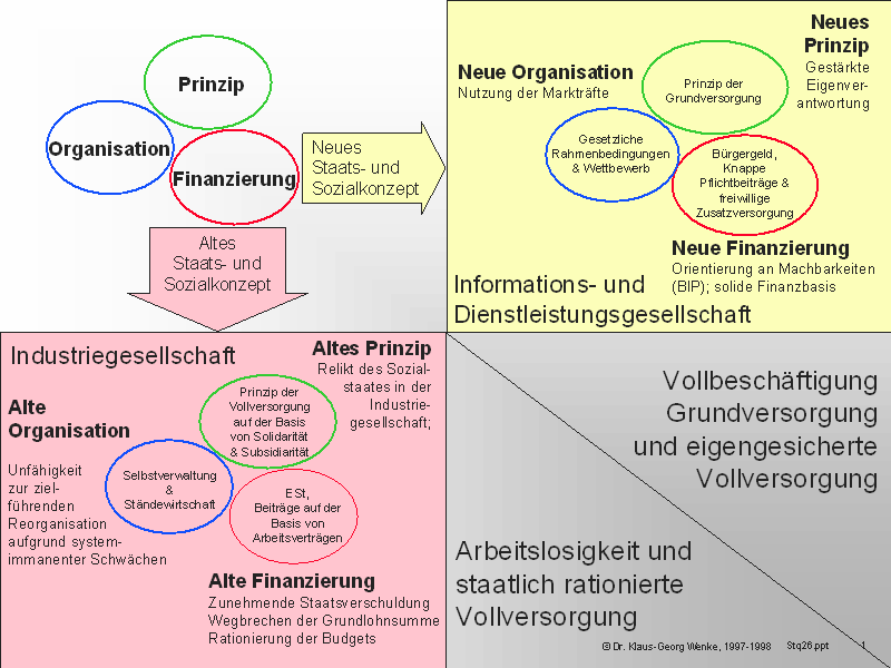 - Die gegenwärtige volkswirtschaftliche Organisation ist auf die Anforderungen und Machbarkeiten einer Industriegesellschaft ausgerichtet (da stammt sie ja her). Sie wird den Anforderungen der Informations- und Dienstleistungsgesellschaft jedoch nicht gerecht. Sie ist zunehmend überfordert und kann systembedingt nicht das leisten, was von ihr erwartet wird. Sie muß dringend reorganisiert werden.