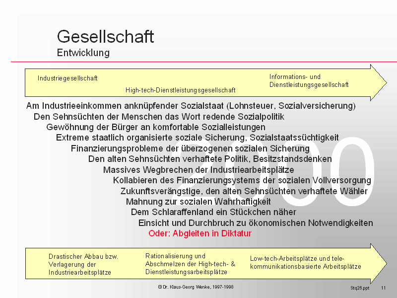 Die Volkswirtschaft und die Gesellschaft sind nichts Statisches sondern ein Prozeß. Schreibt man die aktuellen volkswirtschaftlichen und gesellschaftlichen Prozesse fort, so läßt sich eine Prognose hinsichtlich der wahrscheinlichen Entwicklungspfade aufstellen: