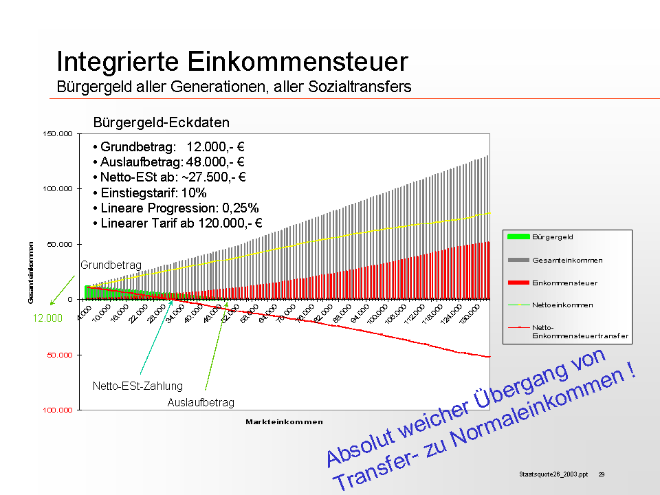 - Kindergeld, Familienlastenausgleich, Arbeitslosigkeitsversicherung, Sozialhilfe, gesetzliche Rentenversicherung und die übrigen ca. 150 Transfersysteme fallen dafür ersatzlos weg.
