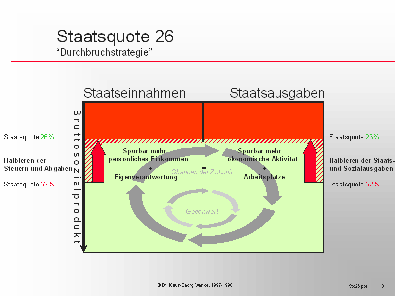 - Drastische Nettosenkung (Halbierung) von Abgaben und Steuern (Staatsquote) von gegenwärtig ca. 52% auf eine zukünftige Staatsquote von ca. 26% (Kernthese zur Einnahmenseite des Staates) in den nächsten drei Legislaturperioden (= 2% pro Jahr). Die schrittweise Freisetzung bzw. Rückgabe von ca. 850 Mrd. DM (die Hälfte der 1995 durch staatliche und parastaatliche Haushalte gelenkten Gelder) an die Bürger wird wie ein gewaltiges Konjunktur- und Strukturentwicklungsprogramm wirken.