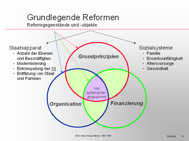 Der gesellschaftlicher Wandel und die Konkretisierung obiger volkswirtschaftlichen Strategie erfordert tiefgreifende Reformen. Hier wird auf der Basis des staatstragenden Grundprinzips Grundversorgung ein aufeinander abgestimmtes Staats- und Sozialkonzept entworfen und zur Diskussion gestellt. Staatsquote