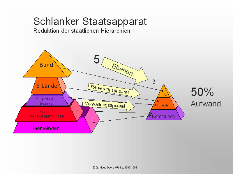 - Weniger Staat ist mehr. Halbieren wir den Staatsapparat und verdoppeln dadurch seine Effizienz und Effektivität. Das geht nicht ohne eine Änderung des Grundgesetzes.