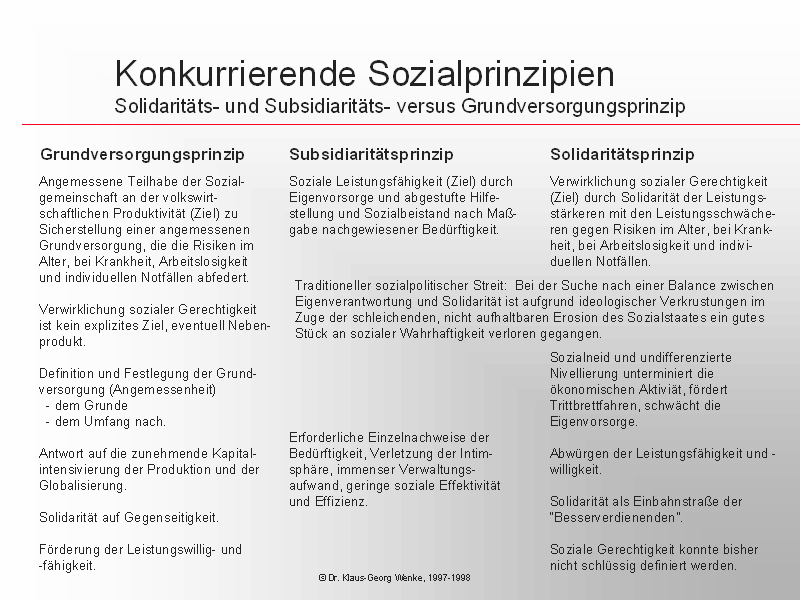 Dem Anspruch der Vollversorgung versuchen die Politiker durch immer neue Wahlversprechen und Gesetzesentwürfe gerecht zu werden. Längst hat sich herausgestellt, daß eine Vollversorgung weder sachlich realisierbar noch finanzierbar ist. Sie immer noch anzustreben, also das alte Sozial- und Staatskonzept auszubauen, erscheint zunehmend kontraproduktiv, denn die faktischen Ergebnisse schmeicheln nicht gerade dem ursprünglichen Ansinnen der Politiker. Es empfiehlt sich in Anbetracht der Nichtleistbarkeit der Vollversorgung, die Ansprüche an ein zukünftiges Sozial- und Staatskonzept etwas bescheidener zu stellen. Reale Machbarkeiten sprechen für die öffentliche Sicherstellung einer Grundversorgung. Je knapper sie ausfällt, desto leistbarer und sicherer ist sie.